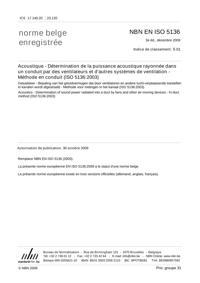 NBN EN ISO 5136 : Acoustique - Détermination de la puissance acoustique rayonnée dans un conduit par des ventilateurs et d'autres systèmes de ventilation - Méthode en conduit (ISO 5136:2003).
