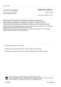 NBN EN 14255-1 : Mesurage et évaluation de l'exposition des personnes aux rayonnements optiques incohérents - Partie 1: Rayonnements ultraviolets émis par des sources artificielles sur les lieux de travail.