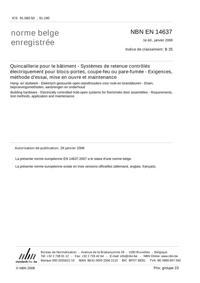 NBN EN 14637 : Quincaillerie pour le bâtiment - Systèmes de retenue contrôlés électriquement pour blocs-portes, coupe-feu ou pare-fumée - Exigences, méthodes d'essai, mise en oeuvre et maintenance.