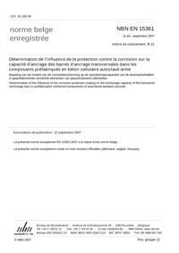 NBN EN 15361 : Détermination de l'influence de la protection contre la corrosion sur la capacité d'ancrage des barres d'ancrage transversales dans les composants préfabriqués en béton cellulaire autoclavé armé.
