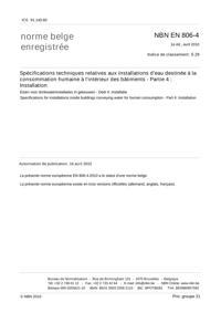 NBN EN 806-4 : Spécifications techniques relatives aux installations d'eau destinée à la consommation humaine à l'intérieur des bâtiments - Partie 4 : Installation.