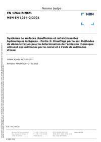NBN EN 1264-2 : Systèmes de surfaces chauffantes et rafraîchissantes hydrauliques intégrées - Partie 2: Chauffage par le sol: Méthodes de démonstration pour la détermination de l'émission thermique utilisant des méthodes par le calcul et à l'aide de méthodes d'essai.