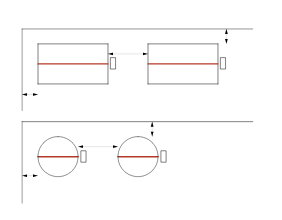 Lors du placement, il convient de veiller à ce que la lame mobile du clapet soit installée dans l'axe de la cloison légère résistant au feu. Sauf mention contraire du rapport d'essai au feu, l'écart entre deux clapets résistant au feu est de 200 mm minimum (voir figure 41). En outre, les clapets résistant au feu doivent être installés à 75 mm minimum des cloisons et des plafonds, et ce notamment pour une raison pratique : permettre le resserrage autour du dispositif d'obturation résistant au feu. En outre, le mécanisme de commande doit rester accessible et démontable en vue de l'entretien.