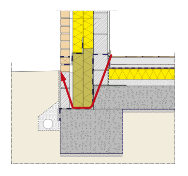 Pour l'obtention d'un noeud constructif conforme à la réglementation PEB, l'application de la règle de base n° 3 consiste à faire en sorte que le chemin de moindre résistance thermique soit supérieur ou égal à 1 mètre (voir la figure 38). Cette longueur doit être vérifiée sur plan et doit être contrôlée en cas d'adaptation du détail sur chantier (épaisseur de la couche de remplissage, épaisseur d'isolation de la dalle, niveau du revêtement de sol extérieur, etc.). Sur la dalle, il est possible d'appliquer une couche de remplissage et une couche d'isolation légèrement plus épaisses, de façon à se ménager une certaine marge.