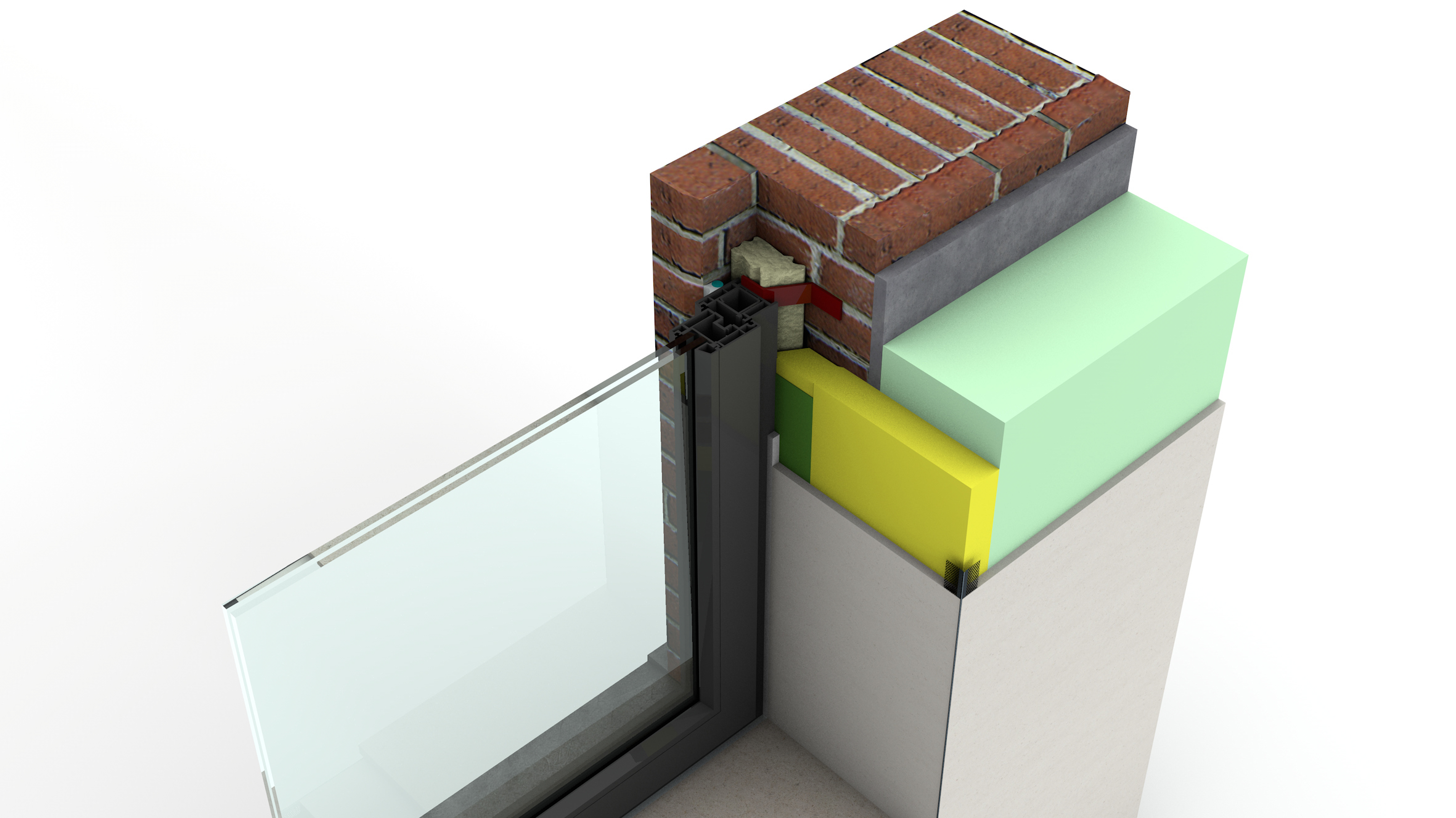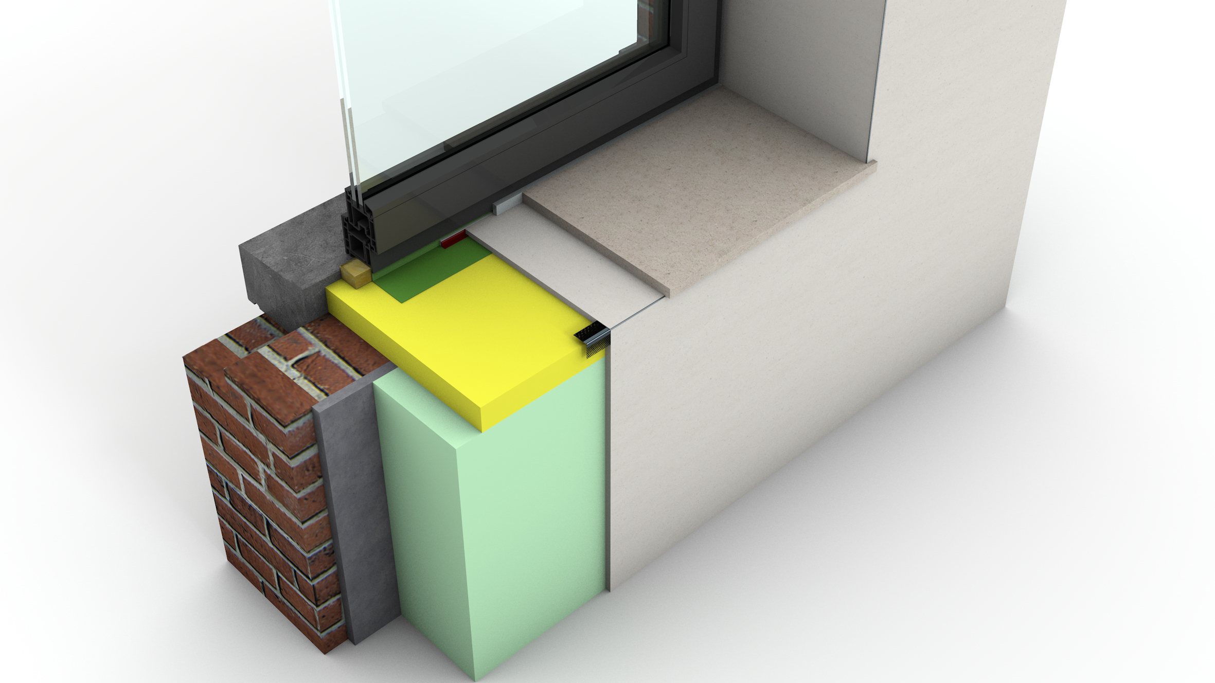 - Il faut assurer la continuité de l'isolation du mur avec celle du profilé de châssis (idéalement, en se conformant aux règles PEB) en prévoyant un retour d'isolant sous la tablette/le long de la battée/sous le linteau. Ce retour est primordial pour éviter les problèmes de condensation au niveau du raccord. Si la continuité de l'isolation est assurée et si le climat intérieur est sain (bâtiment bien ventilé avec une production de vapeur limitée), les risques de condensation et de moisissure sont négligeables pour ce détail.