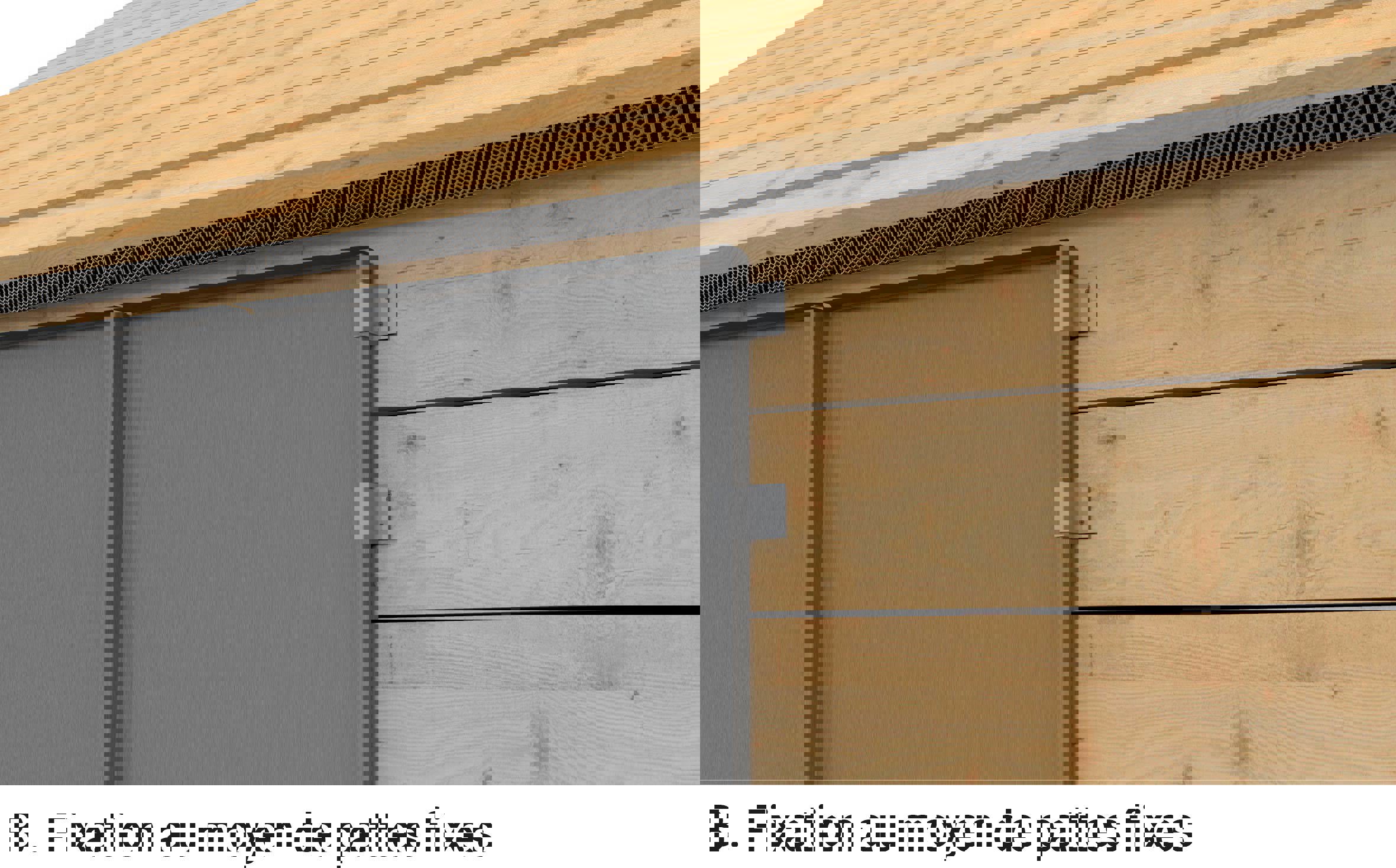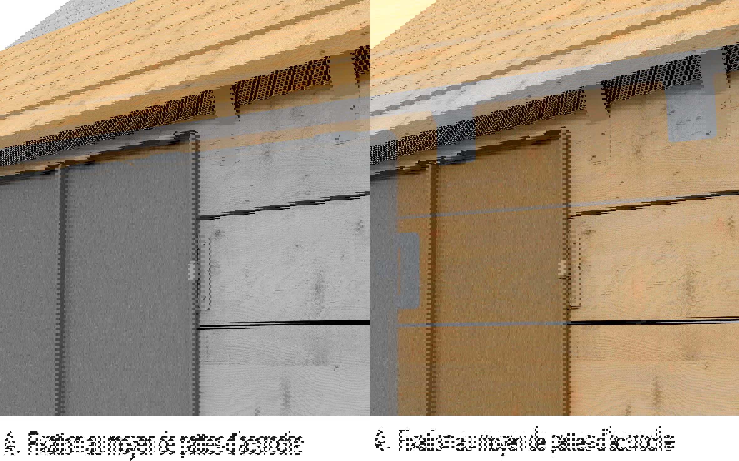 - soit grâce à des pattes d’accroche glissées dans un repli de bande et fixées sur la volige supérieure (voir fig. 2)