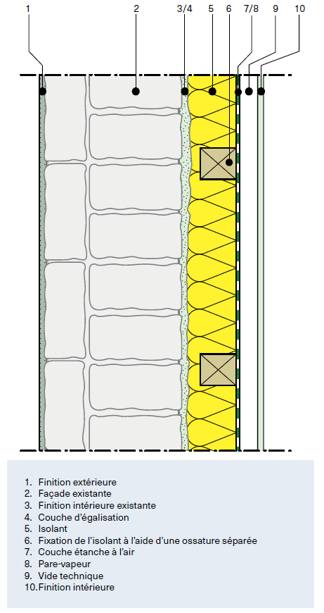➡️ Vous trouverez plus d'information dans la Note d'information technique 300 sur l'solation par l'intérieur des façades existantes.