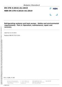 EN 378-4 : 2016+A1:2019 : Refrigerating systems and heat pumps - Safety and environmental requirements - Part 4: Operation, maintenance, repair and recovery.