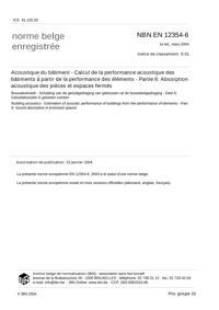 NBN EN 12354-6 : Acoustique du bâtiment - Calcul de la performance acoustique des bâtiments à partir de la performance des éléments - Partie 6 : Absorption acoustique des pièces et espaces fermés.
