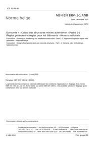 NBN EN 1994-1-1 ANB : Eurocode 4 - Calcul des structures mixtes acier-béton - Partie 1-1: Règles générales et règles pour les bâtiments - Annexe nationale.