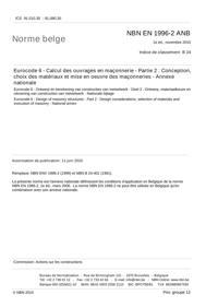 NBN EN 1996-2 ANB : Eurocode 6 - Calcul des ouvrages en maçonnerie - Partie 2: Conception, choix des matériaux et mise en oeuvre des maçonneries - Annexe nationale.