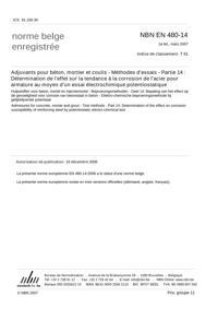 NBN EN 480-14 : Adjuvants pour béton, mortier et coulis - Méthodes d'essais - Partie 14: Détermination de l'effet sur la tendance à la corrosion de l'acier pour armature au moyen d'un essai électrochimique potentiostatique.