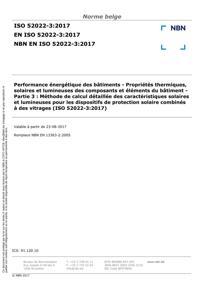 NBN EN ISO 52022-3 : Performance énergétique des bâtiments - Propriétés thermiques, solaires et lumineuses des composants et éléments du bâtiment - Partie 3 : Méthode de calcul détaillée des caractéristiques solaires et lumineuses pour les dispositifs de protection solaire combinés à des vitrages (ISO 52022-3:2017).