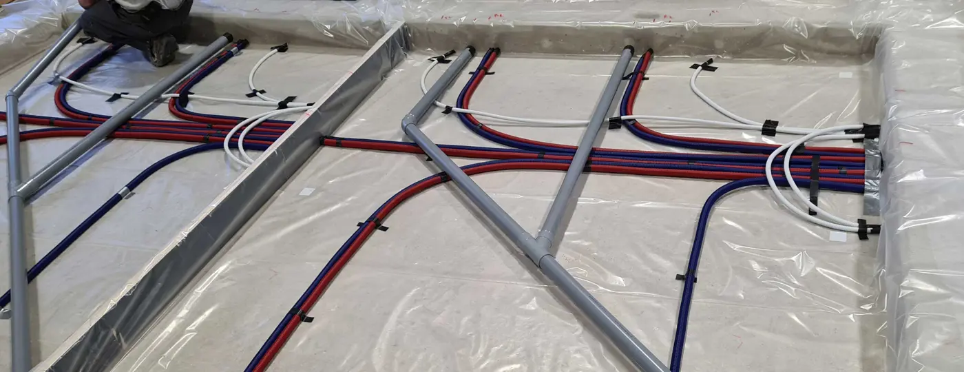Les systèmes de chauffage sol doivent être placés au-dessus de la sous-couche résiliente. Les dispositifs de fixation ne peuvent pas perforer la sous-couche résilient. Si c’est le cas, on peut s’attendre à une perte de performance de la chape flottante acoustique de 2 à 5 dB. Il existe différentes techniques permettant de maintenir les conduites en place tout en préservant l’intégrité de la sous-couche résiliente, comme la pose d’un treillis ou d’une membrane structurée (voir aussi faq).