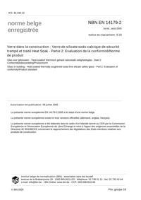 NBN EN 14179-2 : Verre dans la construction - Verre de silicate sodo-calcique de sécurité trempé et traité Heat Soak - Partie 2: Evaluation de la conformité/norme de produit.