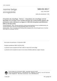 NBN EN 303-7 : Chaudières de chauffage - Partie 7: Chaudières de chauffage central équipées d'un brûleur à air soufflé utilisant les combustibles gazeux de puissance utile inféieure ou égale à 1 000 kW.