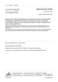 NBN EN ISO 13788 : Performance hygrothermique des composants et parois de bâtiments - Température superficielle inférieure permettant d'éviter l'humidité superficielle critique et la condensation dans la masse - Méthodes de calcul (ISO 13788:2012).