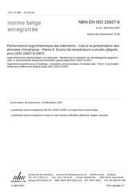 NBN EN ISO 15927-6 : Performance hygrothermique des bâtiments - Calcul et présentation des données climatiques - Partie 6: Ecarts de température cumulés (degrés-jour) (ISO 15927-6:2007).