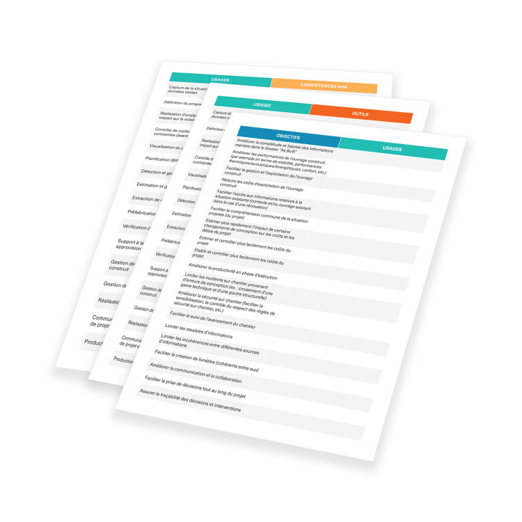 Réaliser des tableaux mettant en relation les objectifs avec les usages, les usages avec les outils, et les usages avec les compétences BIM nécessaires peut s’avérer utile.