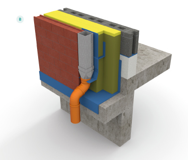 De regenwaterafvoer moet met de nodige zorg op de muurvoet aangesloten worden om te vermijden dat de membranen aan de onderzijde van de gevel doorboord zouden worden. Hiertoe kunnen de membranen ten behoeve van de spouwdrainering onderbroken en van een zijdelingse opstand voorzien worden, terwijl het tweede membraan continu doorloopt onder de aansluiting van de regenwaterafvoerbuis.