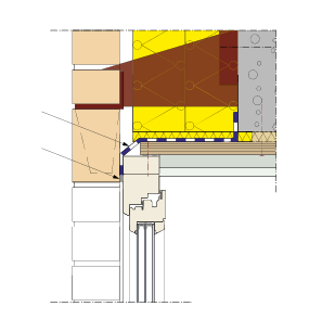 De spouwmuur boven het schrijnwerk dient voorzien te zijn van een membraan dat het spouwwater naar buiten afvoert. Vermits dit membraan per definitie boven de metselwerkankers aangebracht wordt, zal er steeds een deel van de gevel onbeschermd blijven. Om hieraan te verhelpen, kan men een bijkomend membraan aanbrengen tussen de boven het venster gelegen betonbalk en het schrijnwerk. Wanneer het schrijnwerk geplaatst wordt vooraleer het buitenspouwblad aangebracht wordt, levert het voormelde membraan een extra bescherming op tijdens de uitvoering. We willen erop wijzen dat dit membraan uitmondt tussen het schrijnwerk en het gevelmetselwerk en dat men in de (kit)voeg tussen beide elementen een aantal openingen kan voorzien om de afvoer van het spouwwater veilig te stellen (zie afbeelding 49).