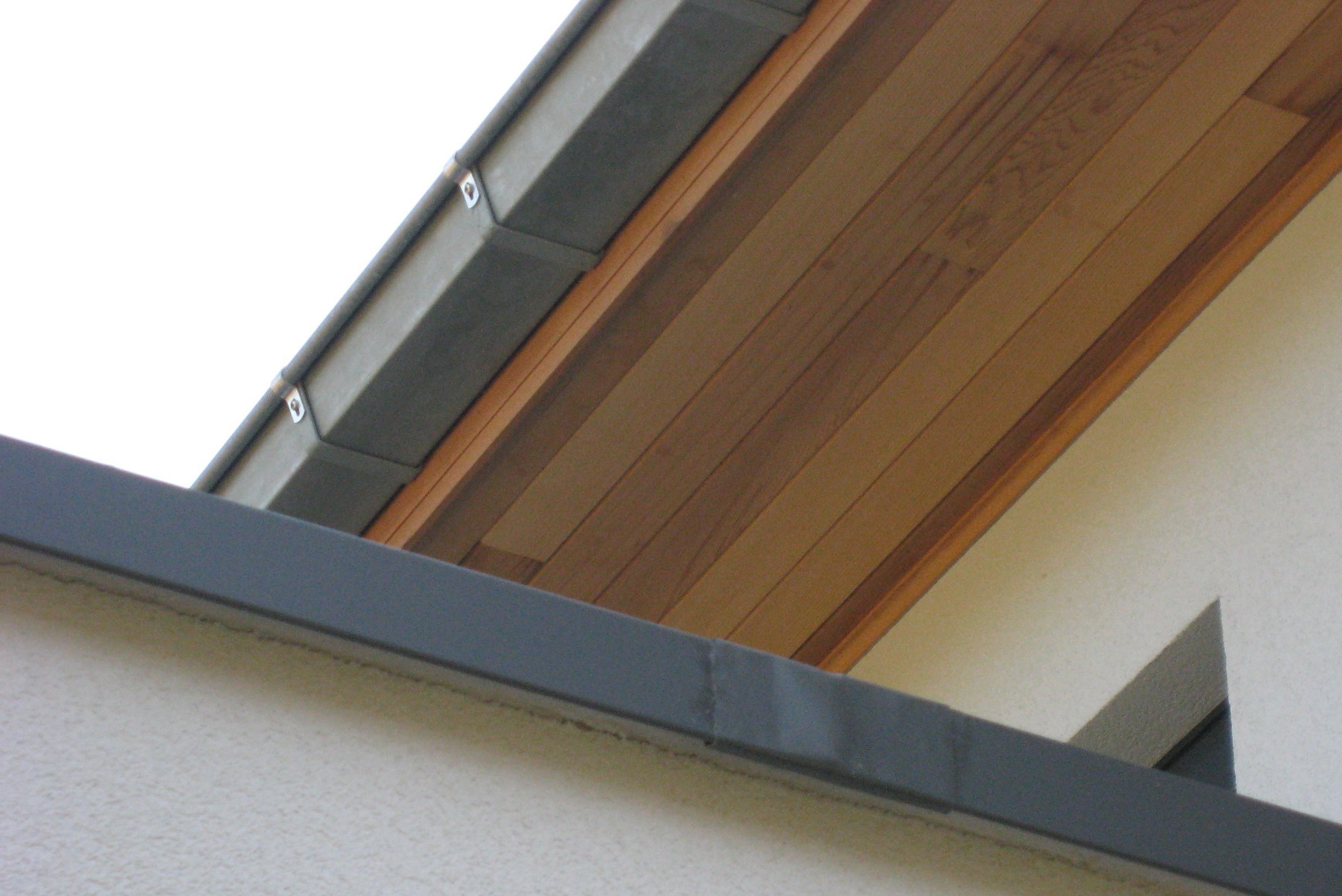 - Het ETICS kan aangesloten worden tot tegen de bekleding van de dakoversteek, waarvan het zichtbare gedeelte vooraf beschermd dient te worden. Er wordt in een afdichtingsband voorzien ter hoogte van de aansluiting tussen de isolatie van het ETICS en de bekleding van de dakoversteek. Na het aanbrengen van de bepleistering wordt deze laatste ingesneden op het niveau van de aansluiting met de bekleding van de dakoversteek en dit, om het risico op eventuele ongewenste scheurvorming te beperken. Het is aan te raden om in een gevelkit (soepele voeg) te voorzien aan de aansluiting tussen de bekleding van de dakoversteek en de bepleistering. Deze taak behoort niet tot het normale takenpakket van de persoon die het ETICS aanbrengt, maar kan wel het voorwerp uitmaken van een afzonderlijke post in de contractuele documenten. Een mogelijke alternatieve oplossing is de plaatsing van een decoratieve dakrand aan de onderzijde, eventueel voorzien van een plint. Dit gebeurt na de uitvoering van het ETICS en eerder aan het bovenste uiteinde ervan, zodanig dat dit deel van de bepleistering aan het zicht onttrokken wordt (zie foto 1).