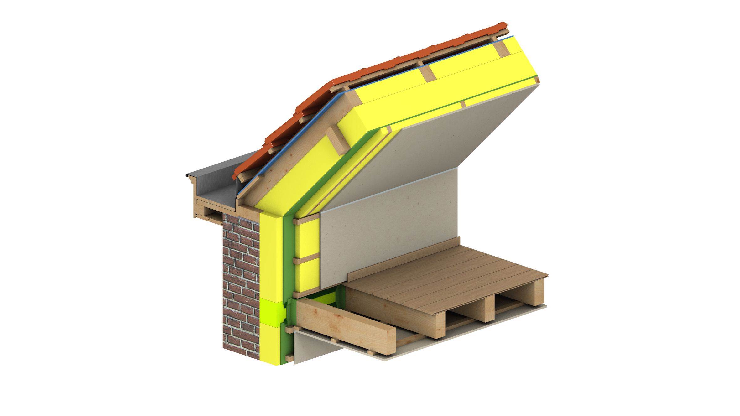 - De continuïteit van de isolatie en de luchtdichtheid tussen het dak en de thermische isolatie van de muur moeten gewaarborgd worden. Daartoe is het noodzakelijk om de bestaande vloer te verwijderen (over een breedte die ten minste gelijk is aan de dikte van de isolatie langs de binnenzijde).