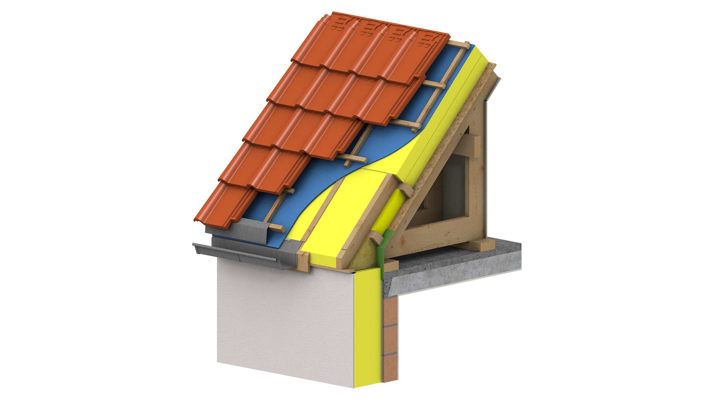 - dan moet ervoor gezorgd worden dat de thermische isolatie van het dak in een latere fase aangesloten kan worden op de isolatie van de gevel. Afhankelijk van de gekozen techniek voor het isoleren van de gevel (ETICS, spouwisolatie of beide) en van de beoogde globale prestatie, moet er in een toereikende oversteek voorzien worden, zodat zowel het ETICS als de gevelbekleding in een latere fase aangebracht zouden kunnen worden.
