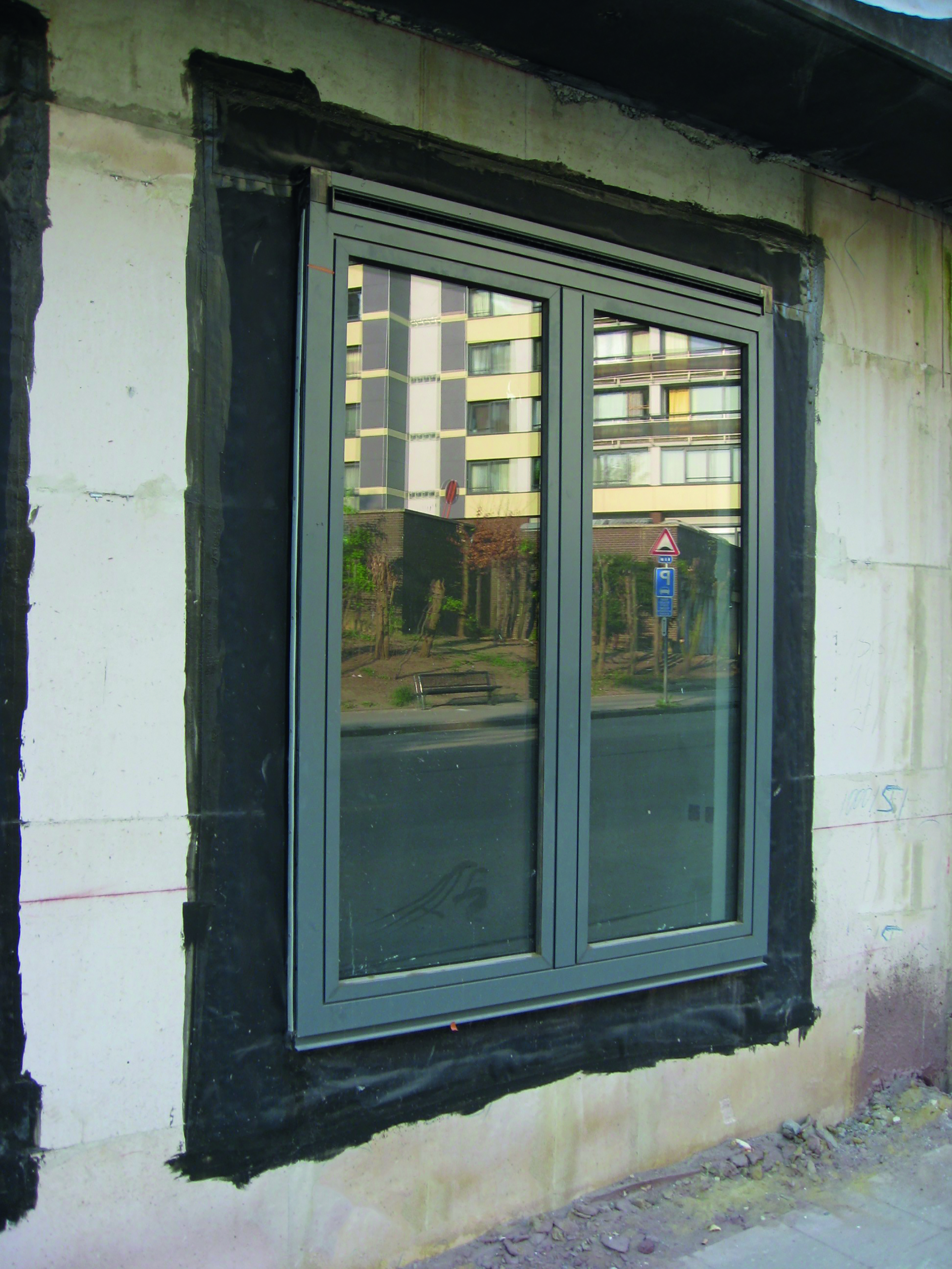 - Soms wordt er voorgeschreven om de aansluiting tussen het schrijnwerk en de ruwbouw uit te voeren met behulp van een tijdelijke bijkomende afdichting (zie foto). Bij de volvlakkige verkleving ervan op de ruwbouw kan deze afdichting de correcte verlijming van het ETICS bemoeilijken. In voorkomend geval wordt de verlijmingszone best zo klein mogelijk gehouden (maximum circa 15 cm). Bij twijfel moet er in de betrokken zone in mechanische bevestigingen voorzien worden.