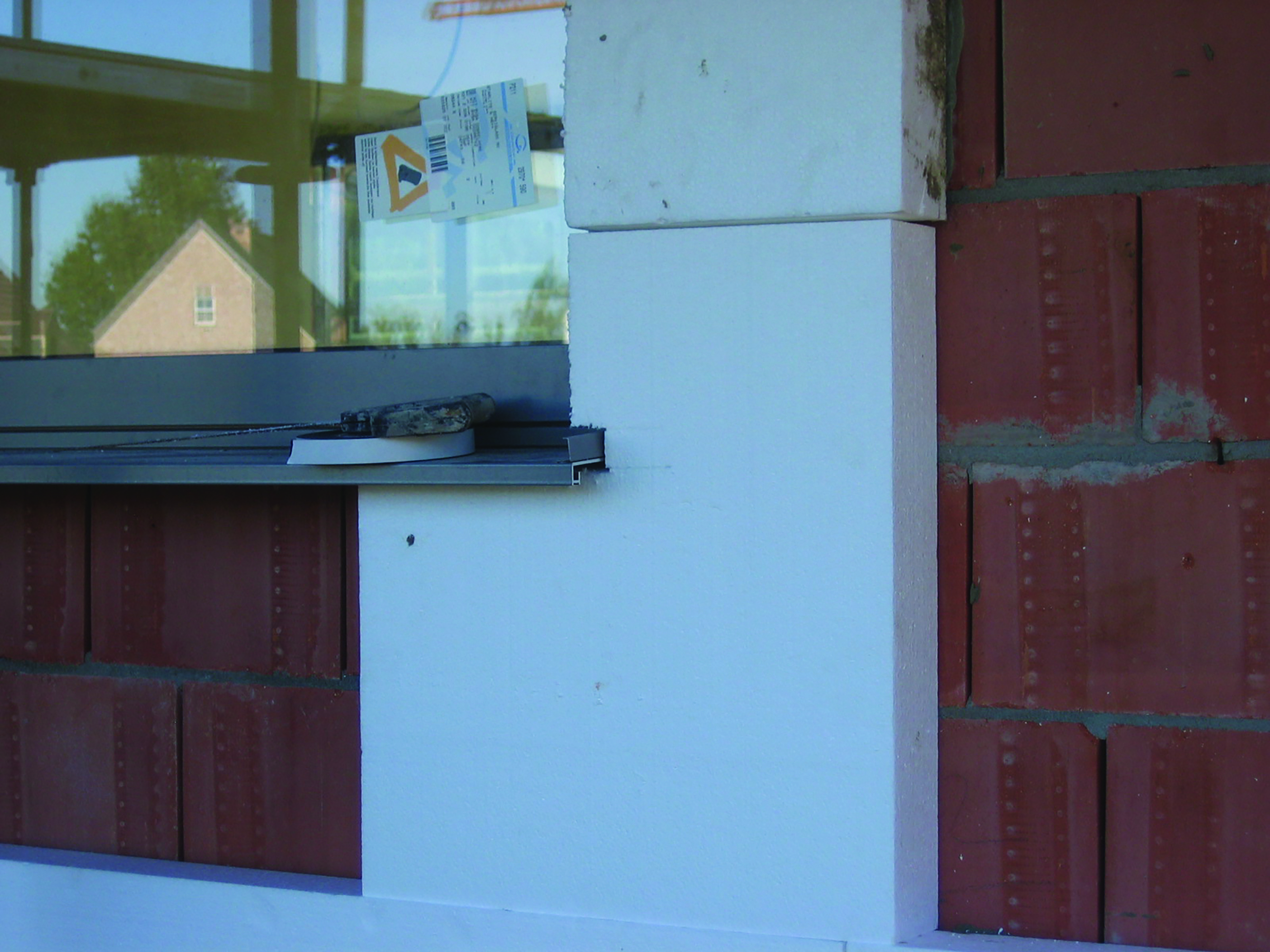 - De regendichte aansluiting tussen het ETICS en het schrijnwerk wordt gerealiseerd door een geschikte afdichtingsband (bv. met een weerstand tegen slagregen van 600 Pa of 900 Pa) aan te brengen tussen de isolatie en het schrijnwerk. Deze afdichtingband moet voldoende samengedrukt worden.