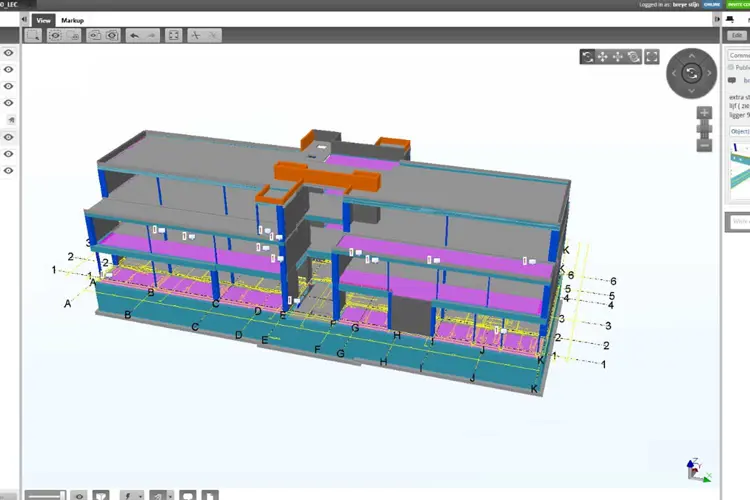 Maar vanaf dit moment begon ook een ‘open BIM-verhaal’. Het uittekenen van de stalen verbindingen werd gedaan door de leverancier van het staal. Daarom werd van het Tekla-model een IFC verstuurd naar de staalleverancier. Daar werden de verbindingen ingetekend in een nieuw bestand op basis van de IFC, hieruit werd dan terug een IFC verstuurd naar de ingenieur van Abicon ter controle (nazicht van de staalstructuur in het volledige model). Via het programma Tekla BIMsight werden in de IFC dan opmerkingen gegeven en op die manier heen-en weer gecommuniceerd met de staalleverancier. Op deze manier werd er heel vlot en correct getekend.