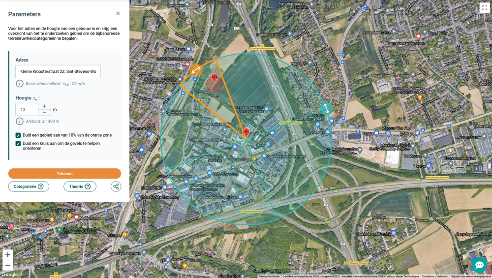 Door het adres en de referentiehoogte van het gebouw in te voeren, krijgt u een beeld van de zone die onderzocht moet worden ter bepaling van de terreincategorieën die geassocieerd zijn met elke windrichting. Deze zone wordt afgebakend door een cirkel waarin u voor elke windrichting de meest ongunstige zone van 30° dient te vinden (de zwakste categorie).