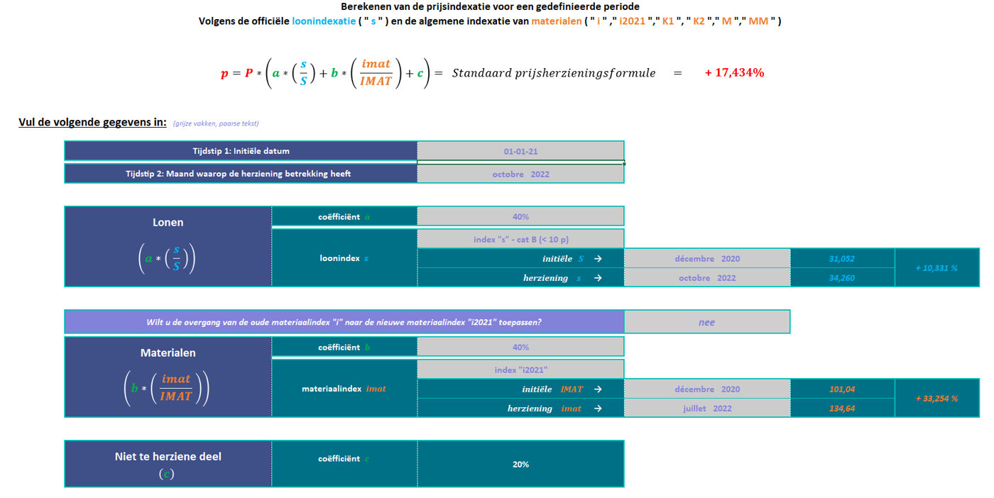 Het tweede werkblad biedt u de mogelijkheid berekeningen te maken met de standaard prijsherzieningsformule van de bouwsector.