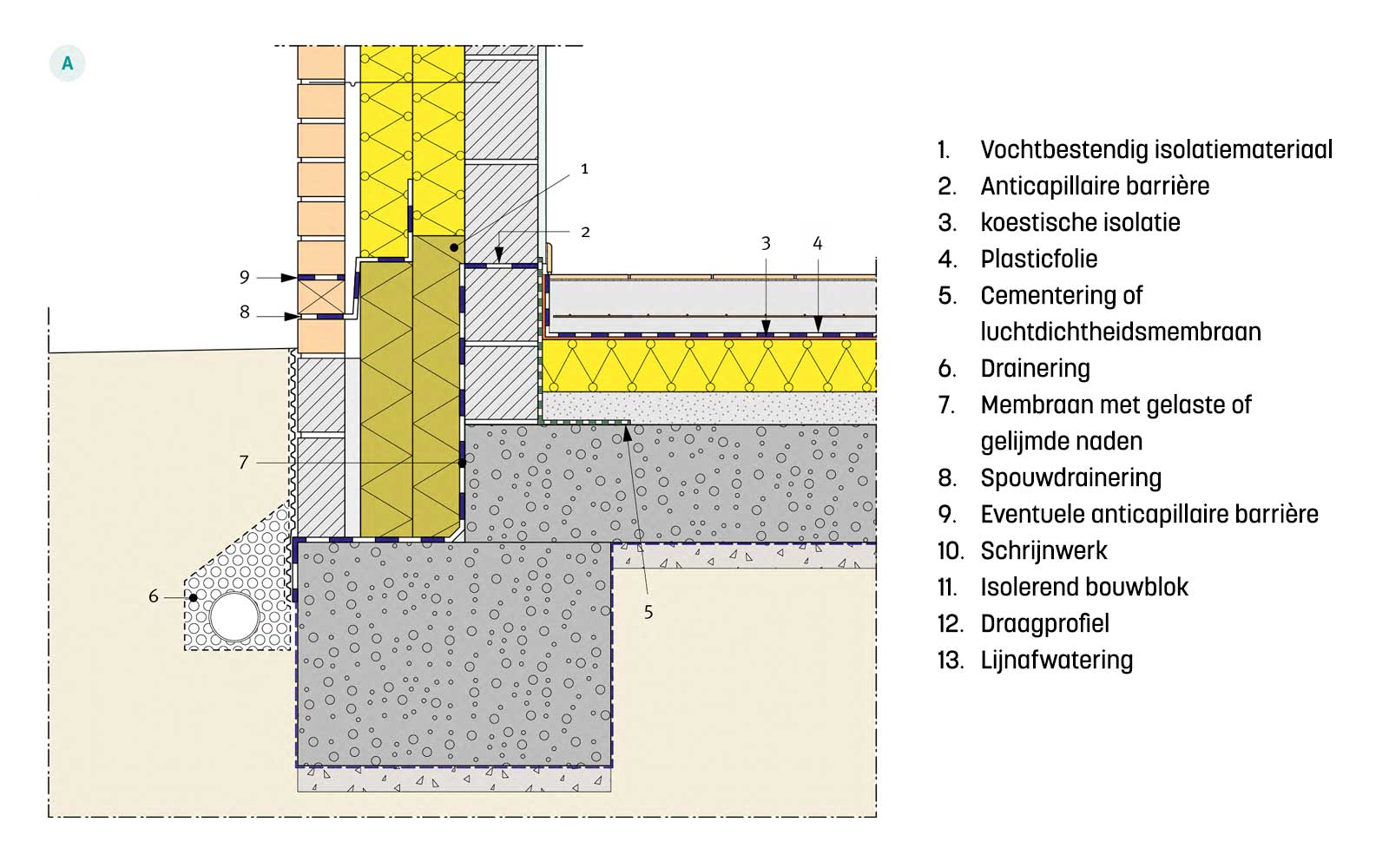 Voor meer informatie hieromtrent verwijzen we naar detail nr. 3.0 van Technische Voorlichting 264 (zie afbeelding) omtrent referentiedetails voor spouwmuren. We willen er eveneens aan herinneren dat de muurvoet zodanig ontworpen moet worden dat er geen zijdelingse waterinfiltraties kunnen optreden.