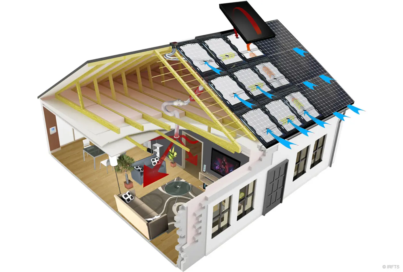 Door fotovoltaïsche panelen onderaan uit te rusten met een systeem voor het terugwinnen van warmte uit de lucht, krijgen ze een aerovoltaïsche werking, waardoor ze meerdere functies kunnen vervullen. Ze kunnen niet alleen elektriciteit opwekken, maar ook het gebouw in de winter en de tussenseizoenen verwarmen, in de zomer instaan voor nachtelijke koeling, de ventilatielucht (voor)verwarmen en het sanitair warm water opwarmen.