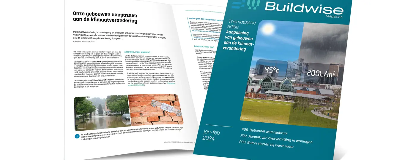 Een speciale editie van Buildwise Magazine bundelt voor elk bouwberoep een boel nuttige informatie over hoe we onze gebouwen en werven kunnen aanpassen aan het veranderende klimaat: waterputten, infiltratie van water, beton storten bij warm weer, groendaken, oververhitting op de werf en veel meer!