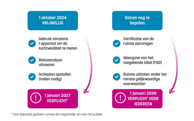 De wet betreffende de verbetering van de luchtkwaliteit in gesloten openbare ruimten werd aangevuld met de wet van 18 mei 2024, die de planning vastlegt voor de inwerkingtreding van de verplichtingen waarin de wet voorziet. De eerste verplichtingen gelden vanaf 01 januari 2027.