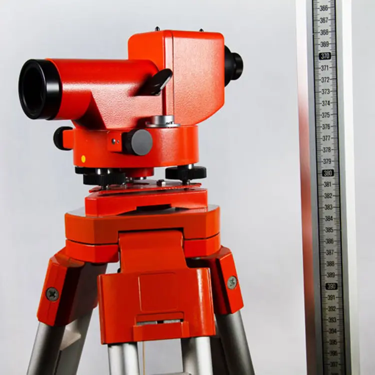 Een optisch apparaat, opgesteld op een statief, waarmee een horizontaal referentievlak gerealiseerd wordt ten opzicht van het welke hoogteverschillen kunnen worden ingemeten.