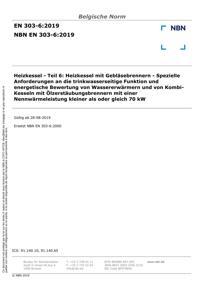 EN 303-6 : Heizkessel - Teil 6: Heizkessel mit Gebläsebrennern - Spezielle Anforderungen an die trinkwasserseitige Funktion und energetische Bewertung von Wassererwärmern und von Kombi-Kesseln mit Ölzerstäubungsbrennern mit einer Nennwärmeleistung kleiner als oder gleich 70 kW.