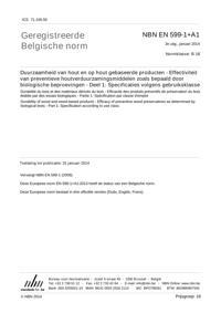 EN 599-1 : 2009+A1 : Durability of wood and wood-based products - Efficacy of preventive wood preservatives as determined by biological tests - Part 1: Specification according to use class.