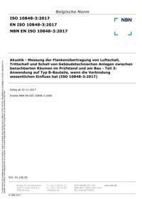 EN ISO 10848-3 : Akustik - Messung der Flankenübertragung von Luftschall, Trittschall und Schall von Gebäudetechnischen Anlagen zwischen benachbarten Räumen im Prüfstand und am Bau - Teil 3: Anwendung auf Typ B-Bauteile, wenn die Verbindung wesentlichen Einfluss hat (ISO 10848-3:2017).