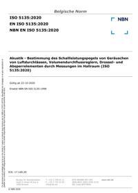 EN ISO 5135 : Akustik - Bestimmung des Schallleistungspegels von Geräuschen von Luftdurchlässen, Volumendurchflussreglern, Drossel- und Absperrelementen durch Messungen im Hallraum (ISO 5135:2020).