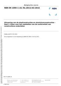 NBN EN 1090-1 +A1 NL : 2013/AC:2016 : Uitvoering van de staalconstructies en aluminiumconstructies - Deel 1: Eisen voor het vaststellen van de conformiteit van constructieve onderdelen.