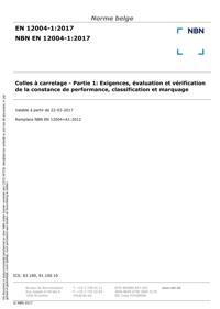 NBN EN 12004-1 : Colles à carrelage - Partie 1: Exigences, évaluation et vérification de la constance de performance, classification et marquage.