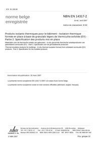 NBN EN 14317-2 : Produits isolants thermiques pour le bâtiment - Isolation thermique formée en place à base de granulats légers de Vermiculite exfoliée (EV) - Partie 2: Spécification des produits mis en place.