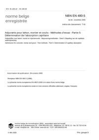 NBN EN 480-5 : Adjuvants pour bétons, mortiers et coulis - Méthodes d'essai - Partie 5: Détermination de l'absorption capillaire.