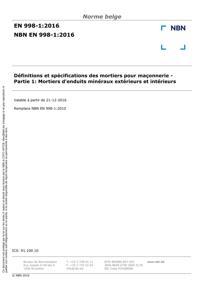 NBN EN 998-1 : Définitions et spécifications des mortiers pour maçonnerie - Partie 1: Mortiers d'enduits minéraux extérieurs et intérieurs.