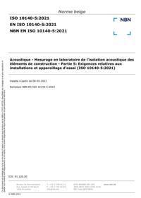 NBN EN ISO 10140-5 : Acoustique - Mesurage en laboratoire de l'isolation acoustique des éléments de construction - Partie 5: Exigences relatives aux installations et appareillage d'essai (ISO 10140-5:2021).