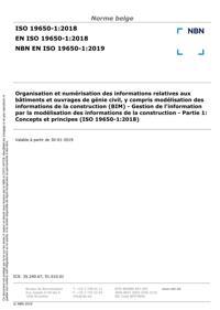NBN EN ISO 19650-1 : Organisation et numérisation des informations relatives aux bâtiments et ouvrages de génie civil, y compris modélisation des informations de la construction (BIM) - Gestion de l'information par la modélisation des informations de la construction - Partie 1: Concepts et principes (ISO 19650-1:2018).