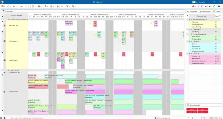 In het planbord kunnen planners via drag-and-drop eenvoudig taken, uitvoerders en materieel koppelen aan projecten, events openen en aanpassen, en de planning helder visualiseren met kleuren, labels en Gantt-weergaven.